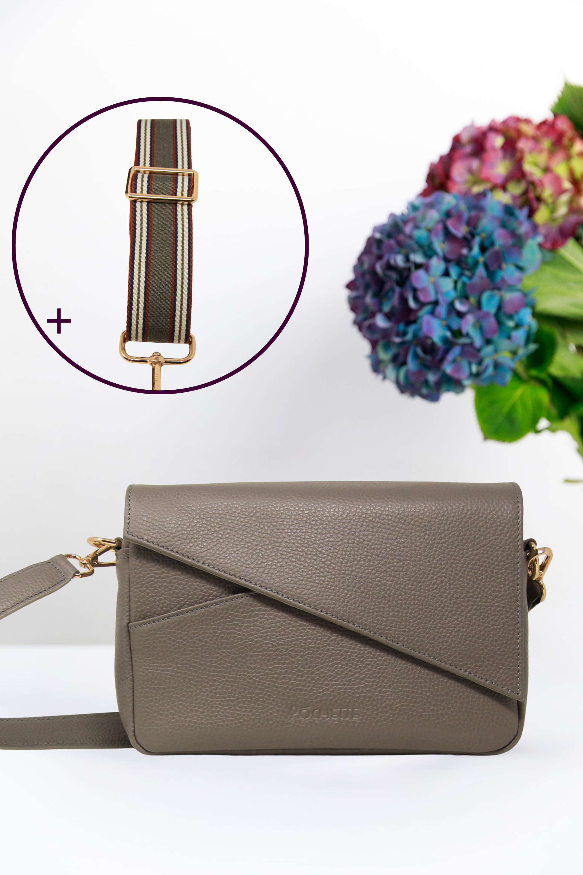 The Danu bag is a customisable bag made from soft pebbled Italian leather lined with a vibrant purple lining we like to call Syrah - making it easy to find what you need inside. This version comes with a shoulder strap and a leather cover in the same colour and the casual crossbody strap with a grey stripe.